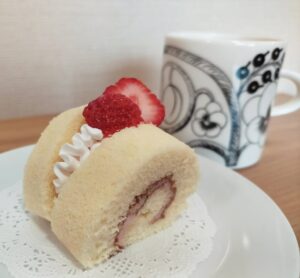今年の節分は2月3日です。恵方巻の由来はいくつかあるようですが、当社のある大阪が発祥という説が有力です。恵方(今年は南南東)を向いて丸かぶりで黙って食べると良いとされています。最近はいろんな種類の恵方巻がありますが、ロールケーキを恵方巻風にアレンジしてみました。と言っても、ココアパウダーの色の黒いものを振りかけただけです。甘いロールケーキに苦みが加わった恵方巻です。節分のおやつにいかがでしょう。(ココアパウダーが多い方が海苔っぽくなりますが、苦すぎるかもしれません。)